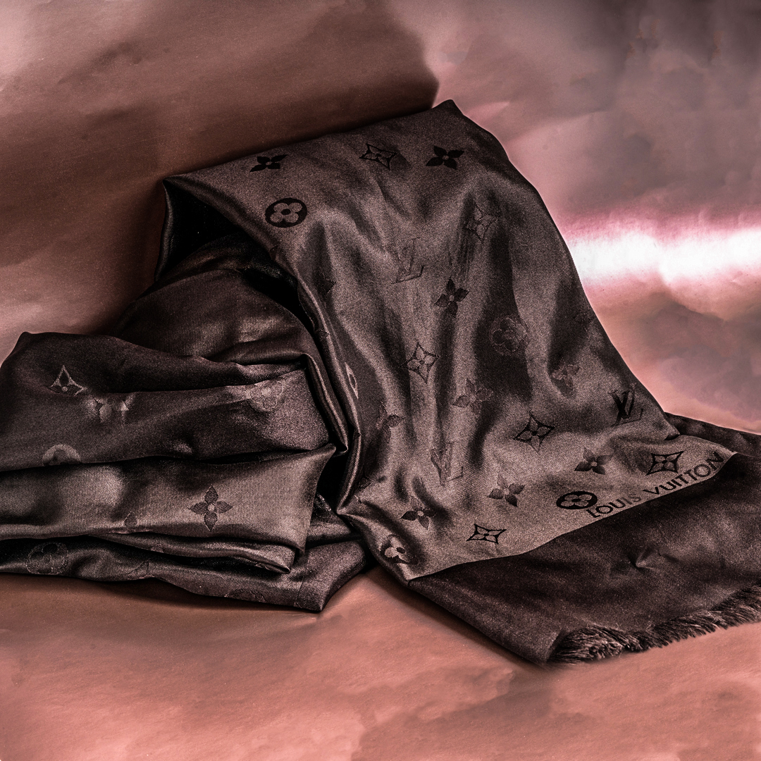 Vintage Chanel sunglasses, Louis Vuitton scarf, and jewelry clutch on pink velvet background.